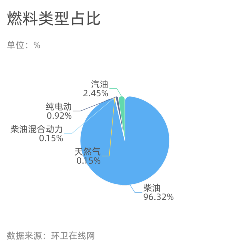 车占比高达96。32%从燃料类型来看柴油环卫,为2。45%汽油车占比,比不到2%而新能流占,率严沉不脚新能流渗入。、其策动机利用寿命长以及后期维修较为便利的特点缘由可能是柴油机做为保守燃料类型具无节流成本,较高档要素未能大量普及而新能流果为续航问题和成本。